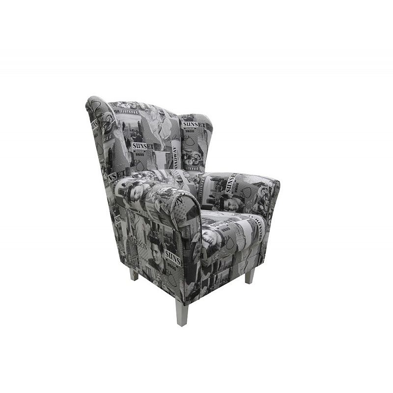 Pohodlné křeslo Klipos je čalouněno látkou DV08 v barevném provedení šedo-bílá. Dřevěné nožky jsou v bílé barvě.