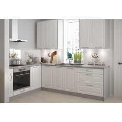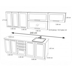 Kuchyňská linka EMPORIUM je dodávána v sestavě 240 cm. V této sestavě je zahrnuta veškerá dvířkovina, korpusy, úchyty, soklová krytí nožiček i pracovní deska. Skříňky jsou rozvrženy pro maximální pohodlí při vaření, tudíž zde naleznete spodní skříňku se zásuvkami, skříňku určenou pro ustavení dřezu a dvoudvéřovou skříňku s policí. V horní sestavě pak najdete čtyři jednoduché skříňky. Všechny skříňky si můžete libovolně přehazovat, jak uznáte za vhodné. V případě, že budete mít zájem o rozšíření kuchyně, je možné doobjednat i jiné komponenty s této řady. Dřez a baterie nejsou součástí sestavy a pracovní deska nemá vyřízlý otvor pro dřez.