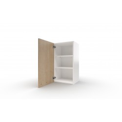 horní závěsná kuchyňská skříňka s dveřmi, za kterými jsou 2 variabilní police. Korpus skříňky je z lamina v bílé barvě, dveře z lamina v dekoru dub Sonoma. Úchytka - kovový oblouček. Dodáváno v demontu