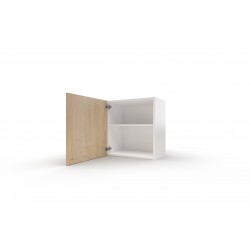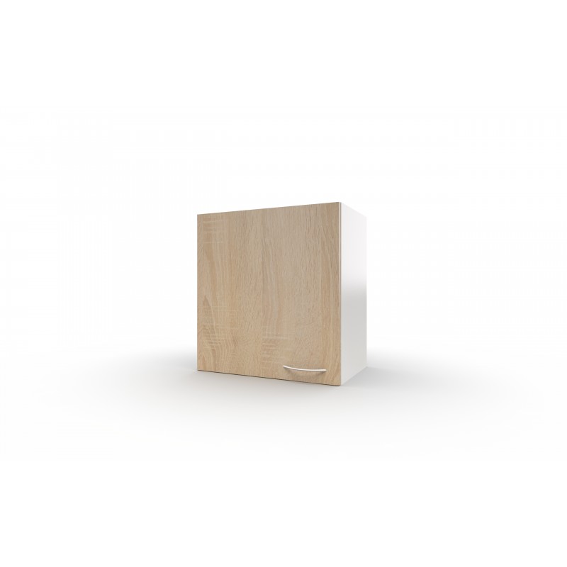 horní závěsná kuchyňská skříňka s dveřmi, za kterými je jedna variabilní police. Skříňka je nižší, aby se pod ni vešla digestoř. Korpus skříňky je z lamina v bílé barvě, dveře z lamina v dekoru dub Sonoma. Úchytka - kovový oblouček. Dodáváno v demontu.