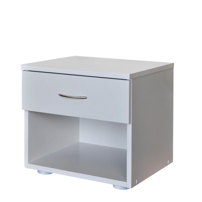Jednoduchý noční stolek se zásuvkou, pod kterou je otevřená nika. Dole kluzáky.