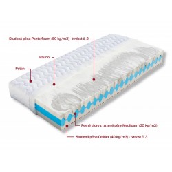 Partnerská matrace z velmi kvalitních pěn PanterFoam a Cellflex, které se vyznačují dlouhou životností. Vrchní strana je tvořena značkovou pěnou PanterFoam (50 kg/m³), která přináší to nejlepší pro Váš spánek. Její vysoká hustota zabezpečí nadstandardní odolnost. Pevné jádro z MediFoam pěny (35 kg/m³) je tvarováno do souměrných vlnek, aby se mohlo přizpůsobit ležícímu tělu. U tvrdší strany matrace oceníte špičkovou kvalitu pěny Cellflex (40 kg/m³). Tato velmi odolná pěna je charakteristická svojí otevřenou buněčnou strukturou, díky které výborně reguluje vlhkost a teplo v matraci. V kombinaci se studenou pěnou PanterFoam tvoří dokonalý pár výborně spolupracujících pěn.