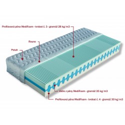 Komfortní, 25 cm vysoká matrace s volbou dvojí tvrdosti. Vrchní vrstvy jsou tvořeny vysoce gramážní pěnou MediFoam s tvrdostí 3 a 4. Tyto odolné a pružné pěny jsou spojené středem s pevným vlnkovitým jádrem bez použití lepidla. Průduchy mezi jednotlivými vrstvami slouží k dobré ventilaci a odvodu přebytečné vlhkosti. Jemná masážní profilace na povrchu pěn uvolní napjaté svalstvo a přinese Vám kvalitní spánek. Matrace je vhodná pro všechny typy roštů.