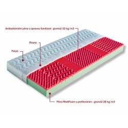 Jádro matrace tvoří vysoce gramážní a velmi elastická pěna MediFoam, která je v místech největšího zatížení změkčena speciálními zářezy ve tvaru „Y“. Jemná masážní profilace horní strany matrace přispívá k uvolnění napjatého svalstva a k provzdušnění matrace. Druhá strana je tvořena antibakteriální pěnou s úpravou Sanitized, která poskytuje trvalou a účinnou ochranu proti bakteriím, roztočům a plísním. Její tvarování do masážních nopů napomáhá provzdušnění prostoru mezi povrchem matrace a potahovou látkou. Matrace je vhodná pro alergiky. Může být položena na všechny typy roštů.