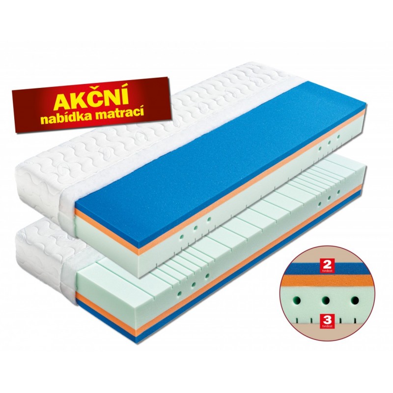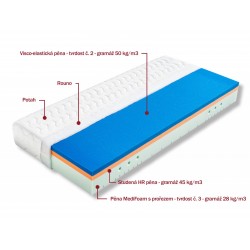 Komfortní matrace s volbou dvojí tvrdosti pro dokonalý odpočinek. Střed ze studené HR pěny s vysokou gramáží matraci provzdušňuje pomocí otevřené buněčné struktury. Díky termoregulačním vlastnostem této pěny je pocení omezeno na minimum. Měkčí stranu matrace tvoří oblíbená viscoelastická pěna, která je charakteristická efektem pomalého vracení. Při kontaktu s lidským tělem optimalizuje svoji tuhost a tvar podle absorbovaného tepla. Tato pěna zajistí optimální regulaci teploty během spánku. Tvrdší stranu matrace představuje pěna MediFoam se zónovým prořezem. Její otvory pod rameny vytvářejí tzv. ramenní kolébku, která ideálně kopíruje ramenní klouby při spánku na boku. Matrace je vhodná na všechny typy roštů, včetně motorových.