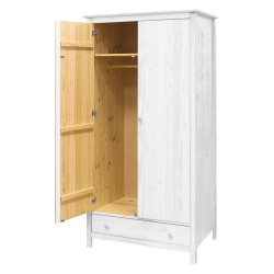 Tato skříň TORINO bílá není typickou bílou skříní jaké znáte. Přes bílou barvu prosvítá struktura dřeva a to tuto skříň dělá neobvyklou a originální. Dispozičně je skříň vybavena jednou širokou zásuvkou s kovovými pojezdy k uložení spodního prádla, šatní tyčí na pověšení oblečení na ramínkách a velkou policí na uložení sezónního oblečení, nebo doplňků. Díky její atypické barvě doporučujeme kombinovat tuto skříň s ostatními kusy nábytku ze série TORINO bílá. Díky tomu docílíte jednotného a originálního vzhledu ložnice nebo šatny.