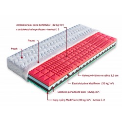 Unikátní ortopedická matrace vhodná také pro alergiky. Jádro matrace se skládá ze dvou odlišných pěn zasazených do sebe podélnou vlnou. Černá pěna (35 kg/m³) je příjemně elastická, modrá tvrdší (35 kg/m³) s vyšším odporem proti stlačení. Ložnou plochu matrace tvoří antibakteriální pěna (32 kg/m³), která má antidekubitní prořez. Pěna je velmi příjemná. Vrstva kokosového vlákna ve výšce 1,5 cm matraci provzdušňuje. Druhou stranu tvoří masážní pěna MediFoam (35 kg/m³) ve tvaru nopů. Pouhým otočením matrace dosáhnete jiné tvrdosti. Je určena pro širokou škálu veřejnosti, která ocení i její výšku.
