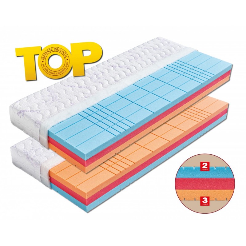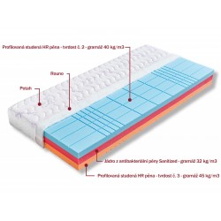 Unikátní matrace z vysoce gramážních studených pěn. Její jádro tvoří červená speciální antibakteriální pěna (32 kg/m³) s úpravou Sanitized, díky které je odolná proti bakteriím, plísním a roztočům. Obě ložné plochy matrace jsou vyrobené z odolných studených HR pěn (40 a 45 kg/m³), které maximálně zvyšují komfort spánku. Strana s modrou studenou pěnou je pocitově měkčí a poddajnější (tvrdost č. 2), protější oranžová strana matrace je pevnější (tvrdost č. 3). Pouhým otočením matrace můžete využít dvou tvrdostí. Čtvercové prořezy těchto kvalitních pěn mají antidekubitní charakter (zamezují vzniku proleženin). Matrace je vhodná na všechny typy roštů, včetně motorových.