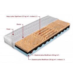 Luxusní matrace s volbou dvojí tvrdosti Vám umožňuje vybrat si tuhost dle Vaší preference. Měkčí stranu tvoří komfortní studená pěna TigerFoam (37 kg/m³) tvarovaná do nopů v sedmi zónách. Tento špičkový materiál je výjimečný svou schopností přesně kopírovat obrysy těla a zajistit vynikající cirkulaci vzduchu. Díky struktuře otevřených pórů účinně reguluje obsah vlhkosti a tepla v matraci. Střed jádra matrace je provzdušněn příčnými průduchy, které zaručují změkčení matrace v exponovaných místech. Je složeno ze dvou značkových pěn MediFoam (35 kg/m³) a jeho spodní část je profilována do jemných masážních vlnek. Tato ortopedická matrace je vhodná pro všechny typy roštů.