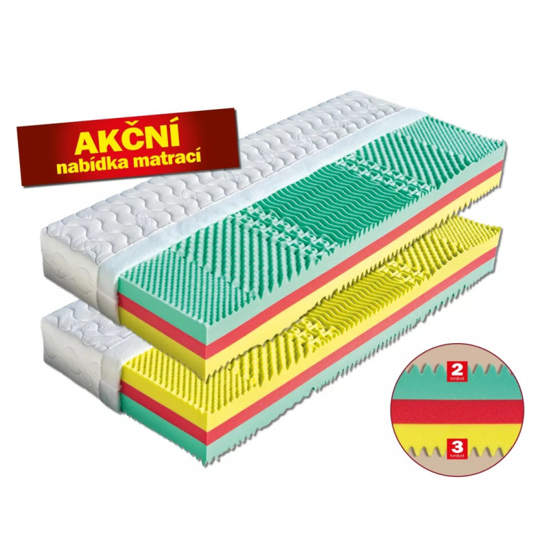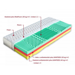 Luxusní matrace s variantou 2 tvrdostí z kvalitních antibakteriálních pěn. Červená střední část jádra zajišťuje optimální podporu těla. Tvoří ji antibakteriální pěna s úpravou Sanitized (32 kg/m³). Měkčí, tyrkysově zelená pěna MediFoam (35 kg/m³) je příjemně elastická (tvrdost č. 2). Pěna limetkové barvy s antibakteriální úpravou Sanitized je pevnější (tvrdost č. 3) a má vysokou gramáž (40 kg/m³). Obě ložné plochy jsou pro větší komfort tvarovány do masážních nopů, které zaručují vysokou úroveň pohodlí a relaxace. Matrace je vhodná na všechny typy roštů, včetně motorových.