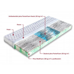 Sedmizónová, velmi pohodlná matrace s volbou dvojí tvrdosti. Vrchní strana je tvořena prodyšnou studenou pěnou PanterFoam (50 kg/m³) s otevřenými buňkami. Oceníte elasticitu a nadstandardní odolnost danou vysokou hustotou. Její středová část je vylepšená antibakteriální pěnou PanterFoam Nautic (50 kg/m³), která je odolná vůči bakteriím a roztočům. Střed matrace tvoří hráškově žíhaná pěna MediFoam (38 kg/m³). Pod rameny je změkčena speciálními zářezy ve tvaru „Y“, které tvoří ramenní kolébku, ideálně kopírující tělo při spánku na boku. Jemná masážní profilace na povrchu pěny přispívá k uvolnění svalů během spánku. Matrace je vhodná na všechny typy roštů.