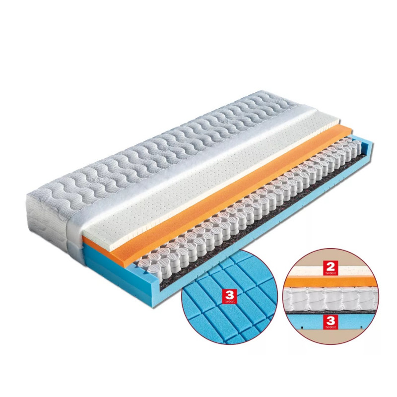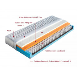 Ortopedická taštičková matrace se systémem velkého počtu samostatně balených pružinek nabízí výbornou podporu těla během spánku. Modrá vrchní vrstva HR pěny s gramáží 40 kg/m³ je opatřena antidekubitními zářezy, tvrdost č. 3. Protější strana s oranžovou HR pěnou je měkčí a poddajnější (tvrdost č. 2) a společně s 4 cm vrstvou Gel-Latexu dokonale kopíruje ležící tělo. Unikátní typ perforovaného latexu má díky mikrokapslím chladivého gelu jedinečné ortopedické vlastnosti. Reguluje vlhkost v matraci, je flexibilní, tvarově stálý a hypoalergenní (eliminuje výskyt roztočů a plísní). Hlavní předností této taštičkové matrace je její vzdušnost a dokonalé kopírování tvaru páteře. Matrace může být položena na pevnou desku a na všechny typy roštů, kromě motorových.
