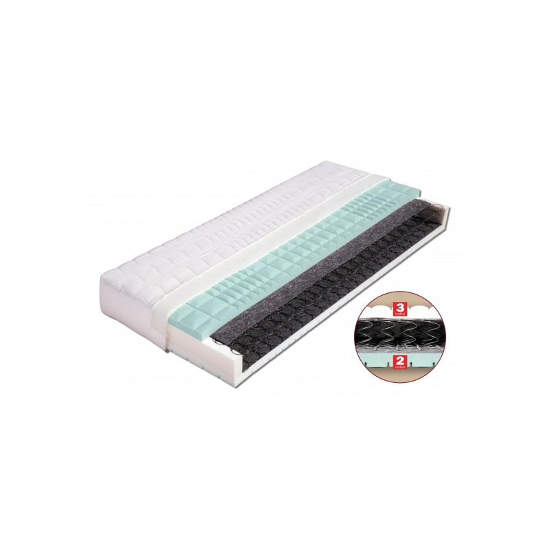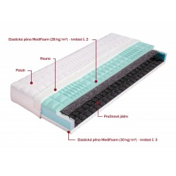 Velmi kvalitní pružinová matrace vrstvená elastickými pěnami MediFoam (28 a 30 kg/m³) různých objemových hmotností, rozdělených do 7 anatomických zón s antidekubitním průřezem. Výška jádra poskytuje uživateli komfort, pevnou anatomickou oporu páteře a zároveň zajišťuje vysokou vzdušnost matrace. Pružinové matrace je možné uložit na rovnou plochu, ale i na pevný lamelový rošt.