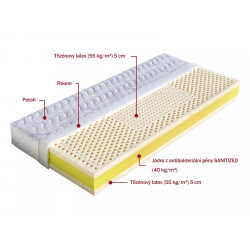 Jádro matrace je složeno ze dvou třízónových latexových desek tloušťky 5 cm (55 kg/m³) a antibakteriálního jádra (40 kg/m³) s úpravou Sanitized, která poskytuje trvalou a účinnou ochranu před mikroorganismy. Díky svým ortopedickým vlastnostem je vhodná pro všechny věkové kategorie, ocení ji alergici i lidé se zvýšenou péčí o klouby. Výborně se přizpůsobuje tvaru těla a přináší maximální pohodlí po celou dobu spánku. Větrací otvory zajišťují optimální cirkulaci vzduchu a efektivně odvádějí vlhkost. Matrace je vhodná na všechny typy lamelových roštů.