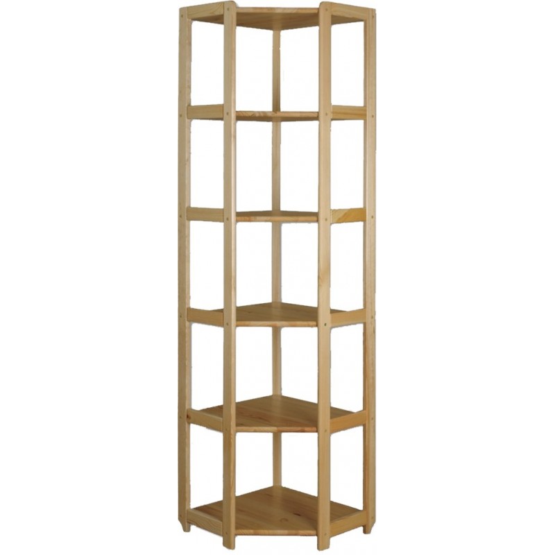 Rohový regál z masivní borovice s lakovaným povrchem. Šířka je 52 x 52 cm. Výška 106 cm a hloubka 55 cm.