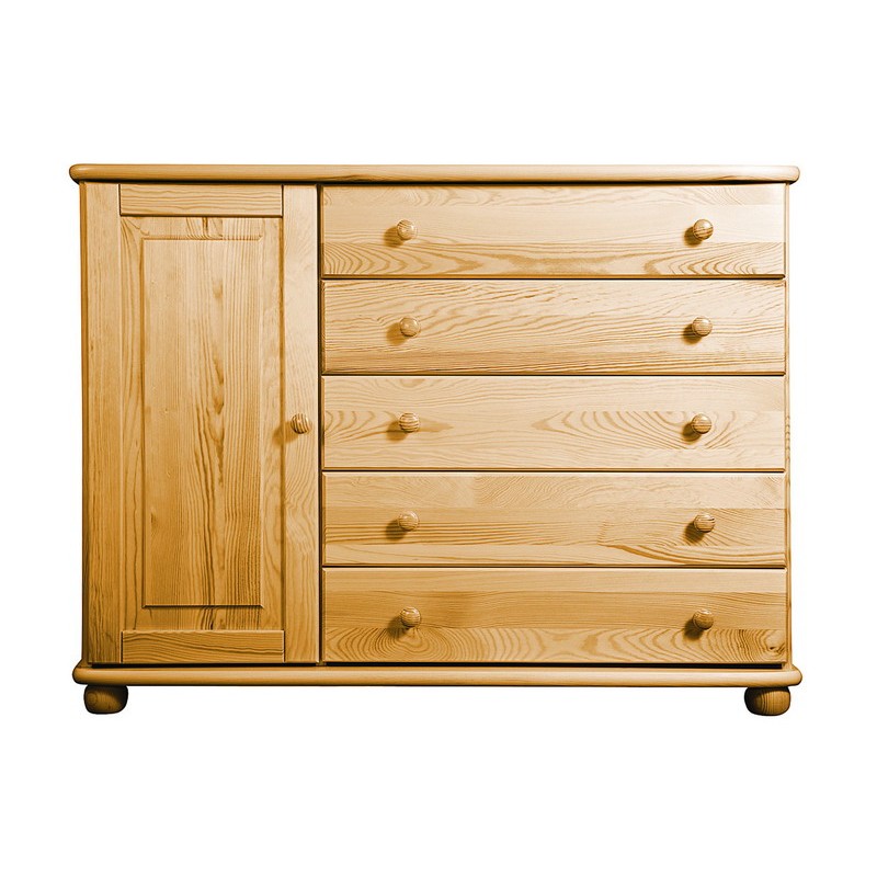 Tradiční borovicový nábytek ve vysoké kvalitě. Vyniká jednoduchostí, klasikou a elegancí. Masivní horní a spodní deska je z masivu o síle 25 mm, čelní plochy jsou bez výrazných suků. Vysoká je úroveň zpracování - dvojí lakování povrchů zvýrazňuje přirozenou strukturu dřeva. Zásuvky jezdí po kovových pojezdech.