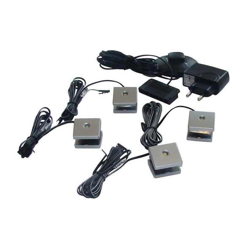 LED osvětlení polic má bílou barvu. Sada obsahuje 4 LED svorky a trafo do zásuvky.