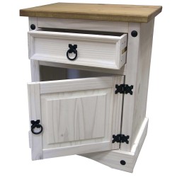 Nábytkem ze sestavy Corona lze vybavit snad celou domácnost. Nábytek z masivu v rustikálním stylu se snadno stane součástí luxusního vybavení vašeho domova. Nejen obývací pokoj lze zařídit tímto velice kvalitním nábytkem, ale i v ložnici si díky němu vychutnáte dokonalou atmosféru. Jestli už máte vybrané lůžko, pak rozhodně stojí za zvážení, po jeho boku umístit i jedinečný noční stolek. Noční stolek CORONA 16345B v provedení masiv borovice, který je voskován v bílém odstínu, bude dokonalým společníkem právě bílého lůžka. Bílý noční stolek s horní deskou v medovém odstínu obsahuje jednu zásuvku a prostor opatřený dvířky. Do prostoru uložíte zajímavé knihy a do zásuvky pak vaše nejosobnější věci, noční stolek je totiž nedotknutelný stejně jako trezor. Noční stolek CORONA je zdoben černými kovovými detaily a úchytkami. Panty dvířek lze umístit na levou či pravou stranu, dle vašich potřeb. Nádherný rustikální nábytek si doslova zamilujete, jedinečnou ložnici si budete chtít užívat nejen u vás doma, ale také na chalupě či chatě. Atmosféře takto vybavené místnosti se totiž nic nevyrovná.