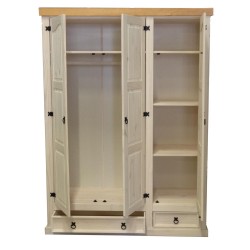 Nábytek Corona v provedení masiv borovice, který je voskován v dokonalém bílém odstínu, bude vypadat naprosto perfektně především ve vaší ložnici. Krásná skříň v oblíbeném rustikálním stylu vás okouzlí a nabídne vám opravdu velkorysý prostor pro uložení celé vaší garderoby. Skříň 3dveřová CORONA voskovaná v bílém odstínu, s horní deskou voskovanou v medovém odstínu, má šikovně dělený prostor v poměru 2:1. V širší části se nachází šatní tyč a police na doplňky, v užší části naleznete tři pevné police k poskládání oblečení. Široká a úzká zásuvka ve spodní části skříně poslouží k uložení prádla. Bílá skříň je zdobena černými úchytkami a výraznými panty, stejně jako ostatní kousky z této úžasné sestavy. Ložnice vybavená robustní skříní a prostorným dvoulůžkem vás bude bavit nejen ve vaší domácnosti, ale také na chalupě či chatě. Kvalitní a originální nábytek bude mít všude zelenou.