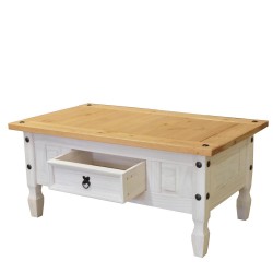 Pokud váš obývací pokoj zdobí kouzelná nábytková sestava CORONA v bílém provedení, nemůžete jinak, než ji doplnit i o stejně kouzelný Konferenční stolek CORONA 163910B a mít radost jak z robustního nábytku, tak z romantické atmosféry prostupující celým pokojem. Voskovaný stolek v krásném bílém odstínu zaujme své čestné místo před vaší sedací soupravou a váš prostor tak získá ceněného pomocníka i neokoukaný kousek nábytku. Konferenční stolek je velice zajímavě řešen, jeho horní deska je voskována v medovém odstínu a vytváří tak na bílém stolku jemný kontrast. Zásuvku uprostřed stolku otevřete pomocí ozdobné kovové úchytky a uložíte do ní všechny potřebné ovladače. Konferenční stolky bývají v mnoha případech velmi jednoduše řešeny, jinak je tomu právě u tohoto stolku, který svým vzhledem připomíná luxusní starožitný nábytek. Tento stolek totiž nebude sloužit pouze k postavení piva, ale na jeho ploše se bude podávat ten nejlepší kaviár a šampaňské, musí mít tedy náležitě reprezentativní vzhled. S konferenčním stolkem ve středu místnosti se stane i obyčejný obývací pokoj dějištěm pro setkávání, oslavy i důležité rozmluvy.