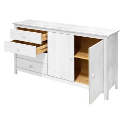 Komody jsou praktickou záležitostí do každé domácnosti. Tato komoda je ze série TORINO. Je vybavena 2 dveřmi a 4 zásuvkami. Barevné provedení je masiv borovice a jedná se pouze o lakovaný kus nábytku. V levé části se nachází 4 zásuvky s kovovými pojezdy v pravé pak 2 plné dveře za kterými se ukrývá 1 police. Vrch komody se dá jako vždy dozdobit dekoracemi, květinami či rodinnými fotografiemi. Díky tomu zajistíte domovu více útulnosti a bude prostor na vás dýchat domácí atmosférou.