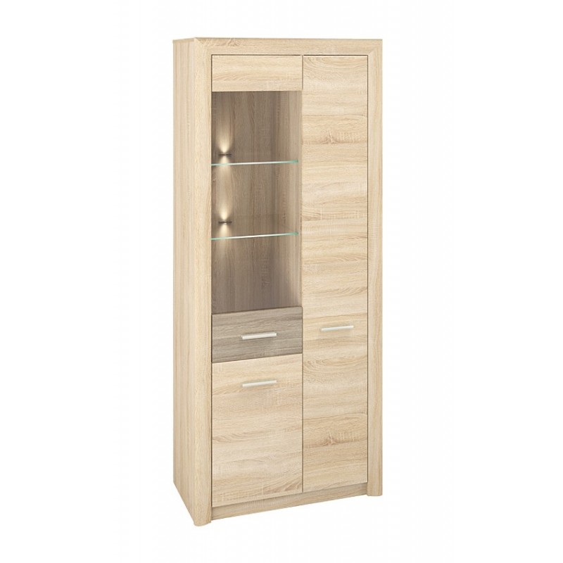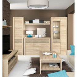 je kolekcí nábytku vyrobeného z lamina ve velmi módní barvě světlého dubu sonoma, která je designově sladěna s rýhovanými prvky MDF v barvě dub sonoma lanýž. Široké zaoblené MDF rámečky kolem korpusu zdůrazňují to, co je pro tento projekt nejdůležitější - spolehlivost při současném zachování delikátního vhledu, který lze použít pro jakoukoliv domácnost či interiér. Elegance nábytku je obohacena tříbodovým LED osvětlením a úchyty v barvě šampaňské, pro perfektní dotvoření charakteru této kolekce.