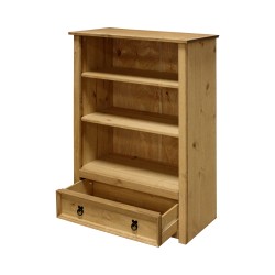 Nižší knihovna je žádaným doplňkem k pracovnímu stolu či k lůžku. Rustikální knihovna se zásuvkou Corona vypadá opravdu krásně. Knihovna v provedení masiv borovice nejenže pojme knížky, suvenýry a fotografie, pokoj také dokonale oživí. Do zásuvky pak ukryjete důležité dokumenty a cennosti, které nemají být na očích. Knihovna v medovém odstínu s černými úchytkami na zásuvce však nemusí být jen zásobárnou knih, lze ji využít i k vystavení věcí. Masivní knihovna tak poslouží snad v každém pokoji, stane se třeba součástí obývací stěny a jídelního koutu. Nejlépe však uděláte, když knihovnu se zásuvkou CORONA umístíte do pokoje zařízeného nábytkem ze sestavy Corona, vytvoříte tak jedinečný a prakticky zařízený prostor, který vám bude nejen spolehlivě sloužit, ale bude především reprezentovat vás dobrý vkus.