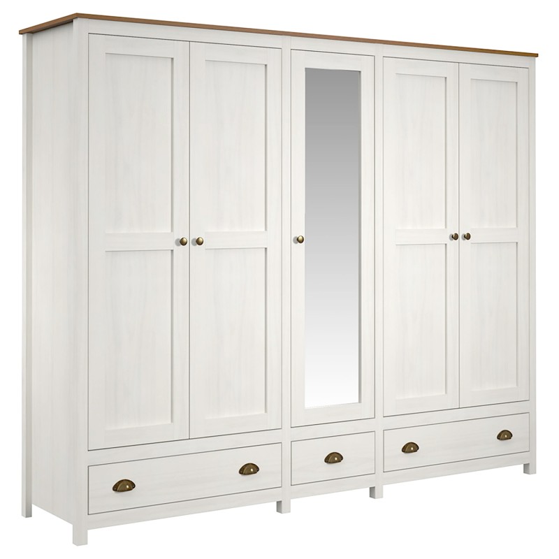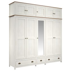Bílý nábytek bude v pokoji vypadat vždy báječně, pokoj díky němu získá velice příjemnou atmosféru. Skříň 5dveřová TOPAZIO v barevném provedení bílý/hnědý lak bude plnit svůj prvořadý úkol, a to umístění veškerého oblečení, velice svědomitě. Skříň 5dveřová TOPAZIO v provedení masiv borovice zaujme svoji pozici jak v ložnici, tak v šatně. Nejlépe si bude rozumět s dalším masivním nábytkem s označením TOPAZIO. Velkou bílou skříň pětidveřovou zdobí kovové úchytky. Moderní skříň nabízí v levé části tři police, ve střední části a pravé části se pak nachází police jedna a kovová šatní tyč. Na středních dveřích je pak vysoké zrcadlo. Ve spodní části skříně naleznete tři zásuvky s kovovými úchytkami a pojezdy na prádlo či doplňky. Pětidveřová skříň uloží oblečení celé vaší rodiny a má krásný stylový vzhled. Pokud by vám přece jen místo scházelo, lze tuto velkou skříň opatřit i 5dveřovým nástavcem TOPAZIO 206954. Praktická skříň v jedinečném designu dá vašemu šatníku dokonalý řád.