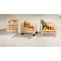 Mějte své zásoby vitamínů přehledně uloženy ve vaší spíži, i náročné děti pak dostanou chuť na čerstvé ovoce a zeleninu. Skládací regál FRUITS je vyroben z masivu v nelakovaném provedení, tři stohovatelné dřevěné bedýnky budou lákat k výběru těch nejlepších kousků. Spodní bedýnka je opatřena kolečky, takže si i plné bedny snadno přesunete, kam potřebujete. Do prakticky vykrojených bedýnek uskladníte brambory, cibuli, česnek, jablka i citrusy. Jednotlivé bedýnky však lze použít i na nákupy, vložit je do kufru auta a pak je pouze přenést do vašeho domova. Skládací regál FRUITS je vhodným doplňkem i do obchodu se zeleninou, do zdravé výživy, restauračního zařízení či fitness centra. Všude tam, kde chtějí žít lidé zdravě a nakupovat pouze čerstvé produkty od místních pěstitelů, má skládací regál FRUITS své místo.