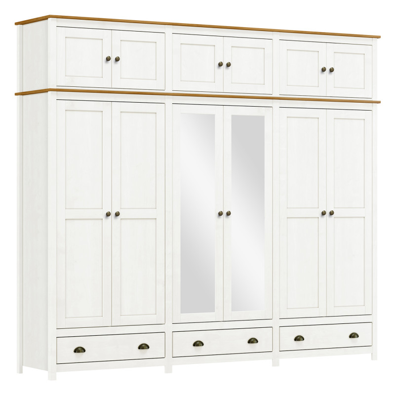 Skříň s dvanácti dveřmi ze série TOPAZIO je kus nábytku, který si rozhodně nezaslouží stát v koutě. Zaujme už na první pohled svou rozměrností a elegantní kombinací bílé a hnědé barvy. Vdechne prostoru vzdušnost a zároveň vytvoří pocit domova. Tato skříň je ideální pro všechny, kteří chtějí mít pořádek ve věcech a zároveň nechtějí řešit kompromisy mezi funkčností a estetikou. Dvoje středové dveře jsou osazené zrcadly, takže nejen že opticky zvětší místnost, ale zároveň nabídnou každodenní pohodlí při výběru oblečení. Za nimi se ukrývají praktické police. Po stranách najdete vždy jednu polici a šatní tyč, ideální kombinaci pro kabáty, saka i jemné halenky. Ve spodní části jsou tři zásuvky, které zvládnou uschovat drobnosti i sezónní textil. Skříň má pevnou konstrukci z masivní borovice a díky lakované úpravě působí upraveně a kvalitně. Nástavec v horní části je součástí skříně a elegantně uzavírá celý celek. Kovové úchytky dodávají rustikální charakter a snadno se uchopují. Celkové rozměry skříně jsou 261 × 54 × 232 cm, což zaručuje dostatek úložného prostoru pro každodenní život i dlouhodobé uskladnění. Tento kus nábytku přináší přehled, stabilitu a klid.
