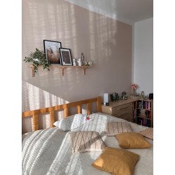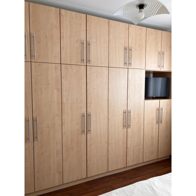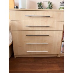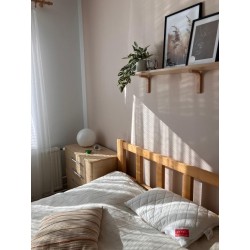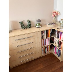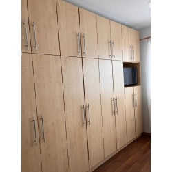 VYBAVENÍ LOŽNICE v rodinném domě - delší stěna je zaplněna skříněmi s nástavci, vybavení skříní - klasika - police a šatní tyče. V jedné skříni je nika na malou televizi. Postel je z bukového masivu / není naše výroba, máme dodavatele/, noční stolky tvoří zásuvkové komody s plnovýsuvy. K jedné komodě ještě navazuje otevřená rohová skříňka - zákaznice využila doslova každé místo v místnosti k uložení oblečení, věcí denní potřeby a svých oblíbených knih. Nad manželským lůžkem je vkusně umístěna závěsná police. Nábytek je vyroben z lamina ve světlém dřevodekoru, který oživují dlouhé chromové úchyty. Cena dle dohody.