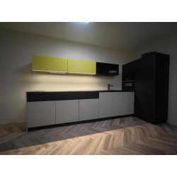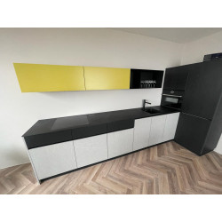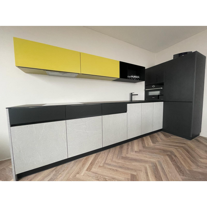 Horní skříňky - stříkaná MDF mat a kovové černá police. Spodní skříňky - plnovýsuvy a skryté zásuvky, čela LTD Pietra Piasentina Grigio - - mramor .