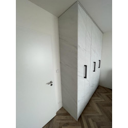 Skříň na zakázku, která disponuje velkými úložnými prostory, které zajišťuje systém polic, šatních tyčí a zásuvek. Přehlednost obsahu podtrhují tzv. zlamovací dveře. Opět čistá a jednoduchá linie, která podtrhuje krásu výrobního materiálu - MDF F812 PM - MRAMOR LAVANTO bílý. Zkosená ocelová úchytka skvěle doplňuje celou kompozici. Přejeme hezké bydlení :-)