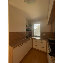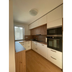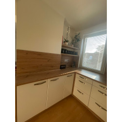 Kuchyně na míru do malého prostotu - úložné prostory jsme řešili až do stropu, místnost jsme obestavěli skříňkami do písmene U - vlevo pouze spodní skříňky s menší hloubkou. Příjemná barevná kombinace - bílá kůže + dub Artisan, na spodních skříňkách masivnější úchytky, horní skříňky mají bezúchytkové otevírání. Spodní skříňky jsou vybaveny plnovýsuvy a dveřními závěsy s dotahem. Dřez kameninový. Všechny spotřebiče jsou vestavné. I na malém prostoru lze zkombinovat estetickou a plně funkční stránku kuchyně- sjednocení pracovní desky s parapetem, začištění koncovou lištou, pracovní prostředí na světle před oknem, postačující úložné prostory.....