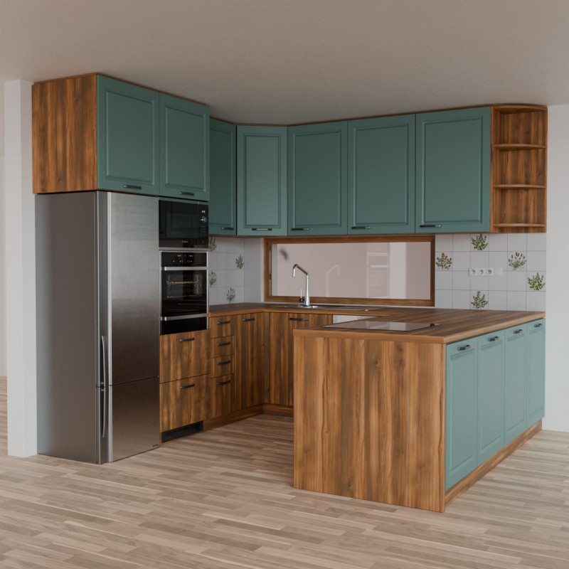 Dřevodekor jsme doladili podle dokončené stavby a tyto krásné dlaždice a k nim i porcelán si zákaznice vybrala na internetu!!! Nádhera !!! Celá kuchyně působí milým a teplým dojmem, koresponduje s výhledem do přírody a celkově s životním stylem majitelů. Zelené dveře jsou MDF stříkaný mat.