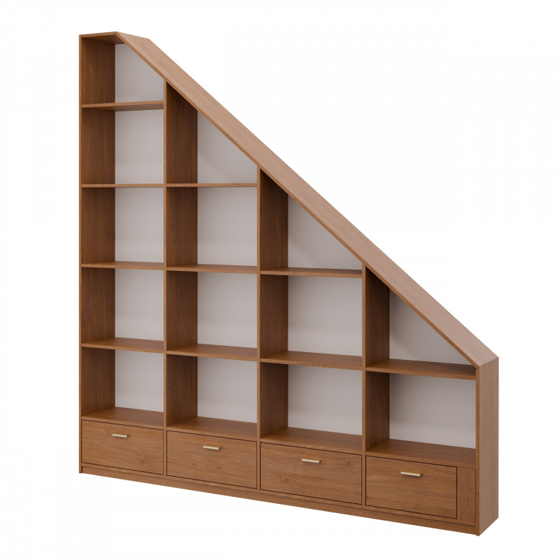 Vyplnit celou zeď policemi, využít místo beze zbytku. Spodní zásuvky s plnovýsuvy schovají drobnosti, police budou sloužit na knihy a suvenýry z cest.
